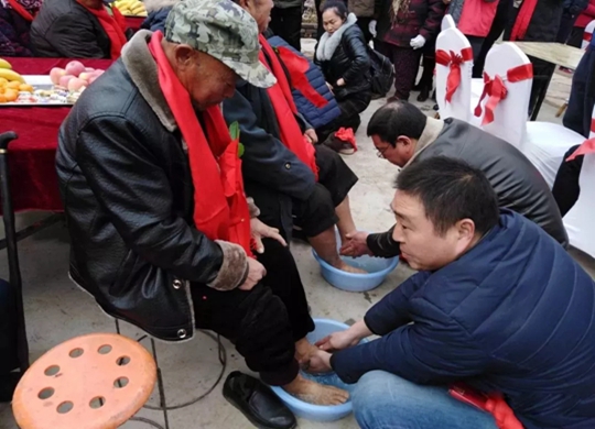 “一盆暖暖的水,温暖了爸妈冰冷的双脚”——孝心儿女为父母洗脚把活动推向了高潮。台上响着轻柔的音乐,台下是一幕幕感人的画面。50名孝心儿女为父母洗脚,坐在椅子上的父母眼中泛着泪光,露出了欣慰的笑容。香甜的蛋糕,感动的泪水。棵棵梨树下,梨园村村民和党组织的心紧紧贴在了一起。