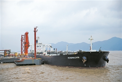 昨日,“彼得罗斯克”轮靠泊外钓油品30万吨级码头。(叶思佳摄)