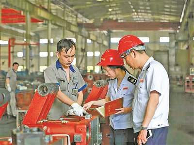 北仑区(开发区)税务局实地走访海天塑机集团,听取企业对外贸易、海外业务进展情况,实地辅导解决企业困难。图为税务人员深入车间了解塑机机床设备生产情况。(董娜张璐妍摄)