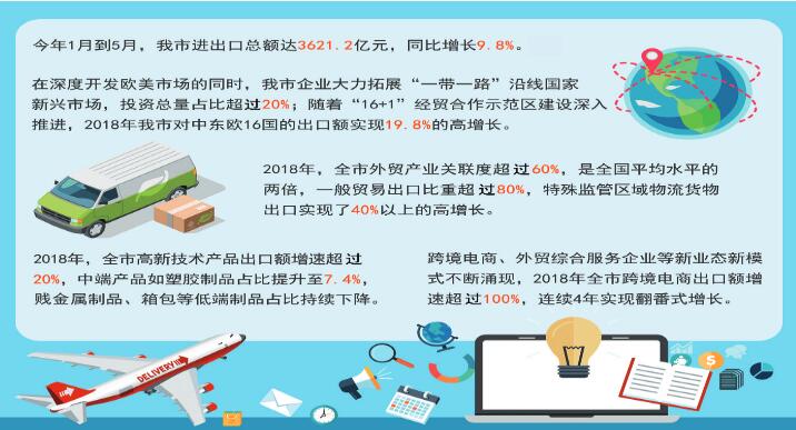 面对多变的国际贸易环境,宁波外贸在机遇中快速发展,也在危机中寻求突破。在深度开发欧美等传统市场的同时,不少企业以建设“一带一路”综合试验区为契机,大力拓展新兴市场,全市在“一带一路”沿线国家的投资总量占比超过20%;随着“16+1”经贸合作示范区建设深入推进,全市与中东欧国家的贸易规模不断扩大,2018年对中东欧16国的出口额实现19.8%的高增长。