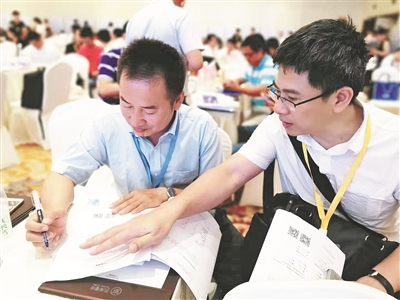 长春工业大学服装系教师(左)与服装企业代表商讨对接事宜。(余建文摄)
