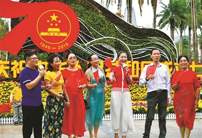 台风过后,甬城阳光灿烂,市民在东门口大型花坛前唱歌、留影,共享国庆节美好时光。(严龙摄)
