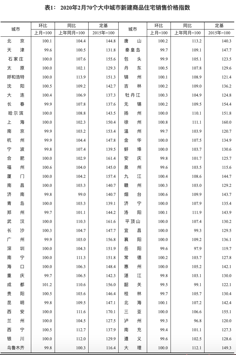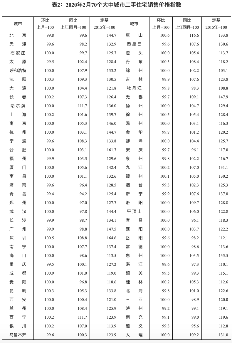 二手住宅销售价格环比由上月上涨0.2%转为下降0.1%,包头、锦州和扬州等12个城市无成交。重申“不把房地产作为短期刺激政策”3月16日,国务院新闻办公室就2020年1-2月份国民经济运行情况举行的发布会上,针对如何看待“2月份70个大中城市房价涨幅回落”的问题,国家统计局国民经济综合统计司司长、新闻发言人毛盛勇表示,关于房地产政策是非常明确的,第一,房住不炒的定位没有改变。这些年,我们不断加强和完善房地产调控政策,实施因城施策的政策,强化或者落实地方城市主体责任。这几年房地产市场总体平稳,这样一种局面已经基本形成,特别是稳地价、稳预期、稳房价的局面已经初步形成。第二,房地产的发展政策也是比较明确的,我们还是要按照推动高质量发展的要求,不把房地产作为短期刺激政策。