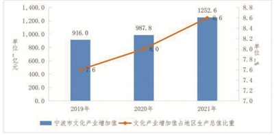 文化产业规模与业绩双提升。按照宁波统计口径,2021年全市文化产业增加值为1252.6亿元,同比增长26.8%,占地区生产总值比重提高至8.6%,成为区域经济发展的支柱性产业。其中,宁波市文化产业小服务业与贸易业增加值占全部文化产业增加值的比重分别达到51.5%与11.6%,比2020年分别提升2.5个与0.7个百分点。